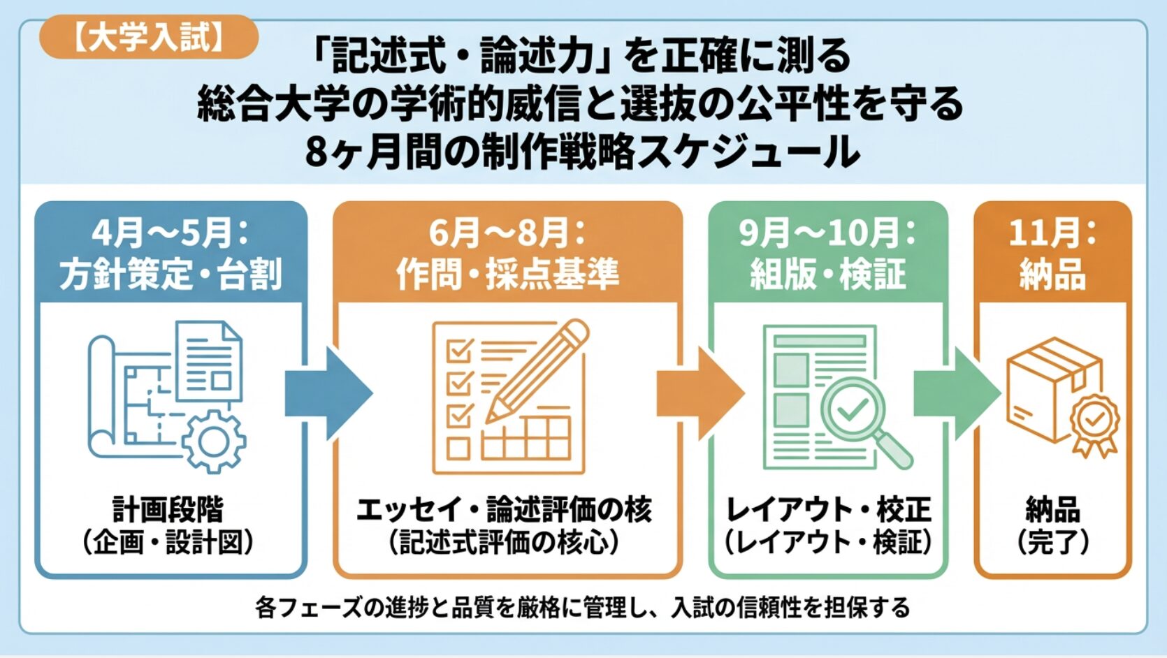 【大学入試】「記述式・論述力」を正確に測る。総合大学の学術的威信と選抜の公平性を守る、8ヶ月間の制作戦略スケジュール