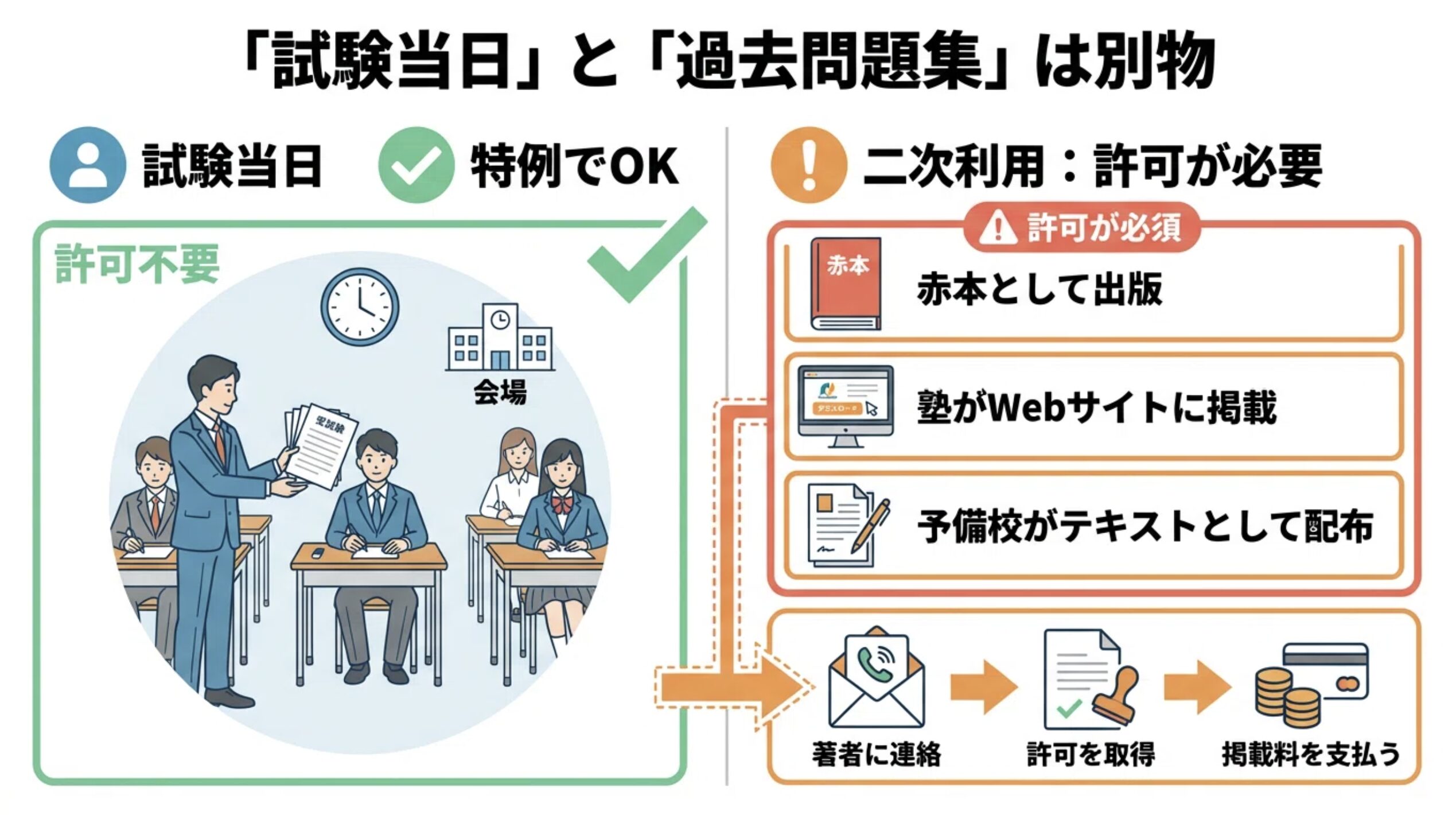 試験当日に問題を配るのは「特例」でOKでした。 しかし、それを「赤本」として出版したり、塾がWebサイトに掲載したり、予備校がテキストとして配ったりすることは、特例の範囲外になります。