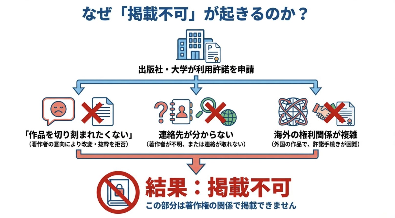 ・「私の作品を入試問題のように切り刻まれたくない」と断られるケース・連絡先がどうしても分からなかったケース ・海外の著者で、権利関係が複雑すぎて交渉が決裂したケース