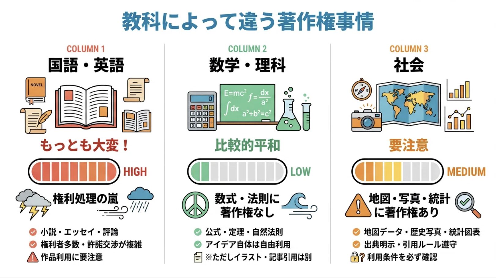 実は、教科によって著作権のハードルは大きく異なります。