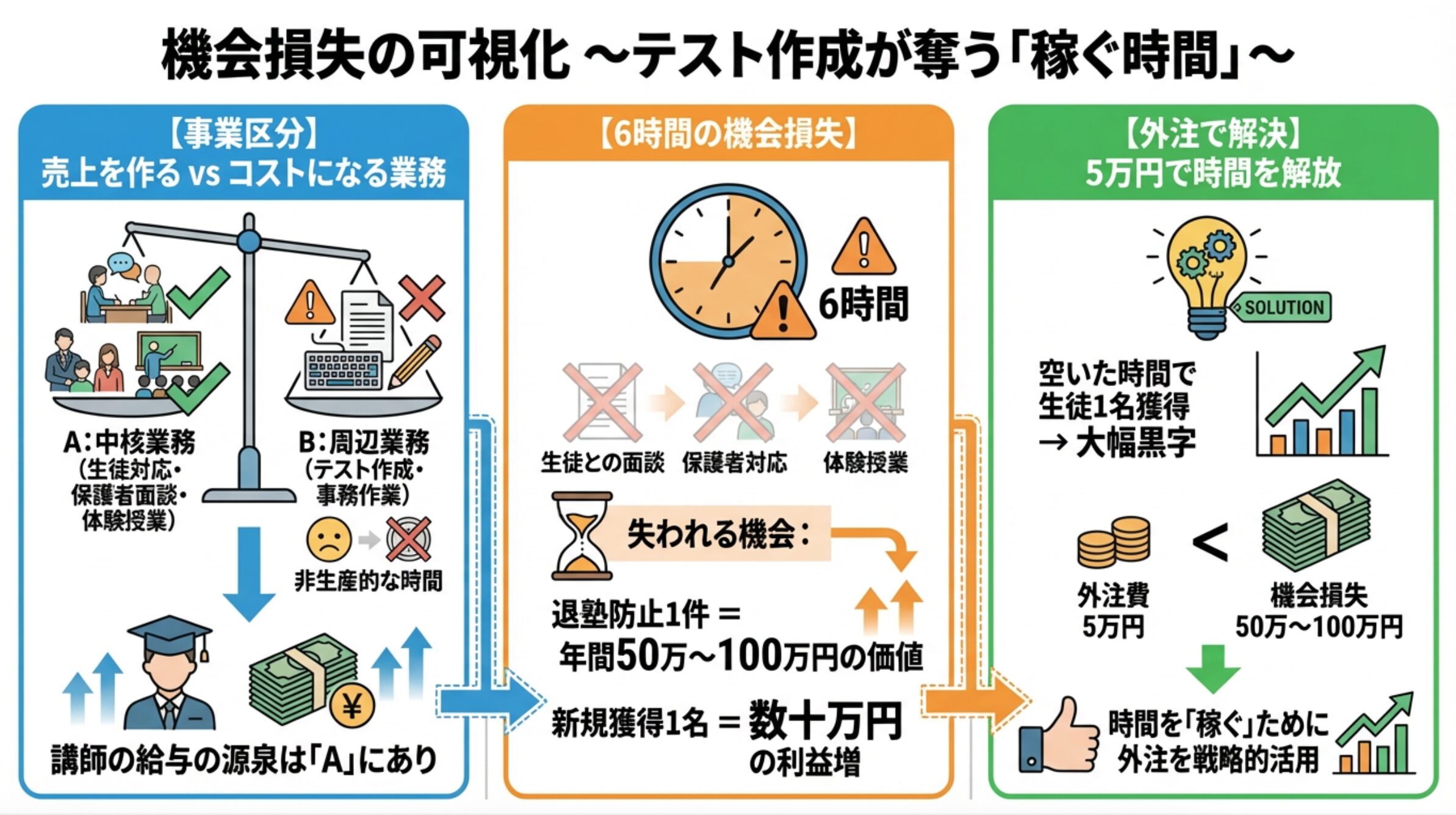 もし、テスト作成の6時間を「生徒面談」に使ったらどうなるでしょうか。悩んでいる生徒3人とじっくり話し合い、モチベーションを上げて「退塾」を1件防げたとします。塾の顧客生涯価値を考えると、生徒1名の維持は年間50万〜100万円の価値があります。
