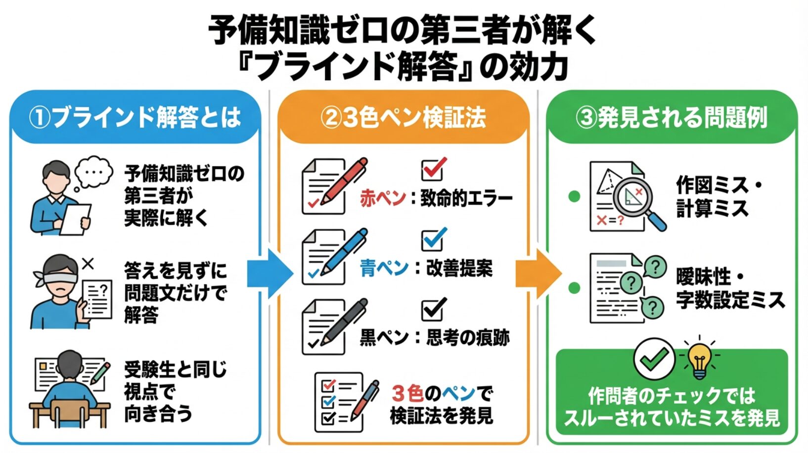ブラインド解答は、単なる「間違い探し」ではありません。教育サービスにおける品質保証(QA:Quality Assurance)の一環です。