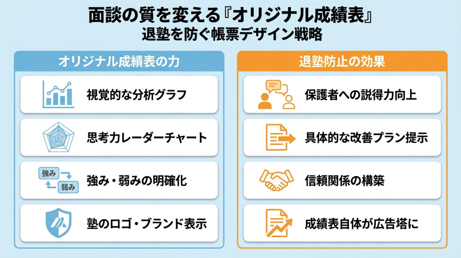 面談の質を変える「オリジナル成績表」。退塾を防ぐ帳票デザイン戦略